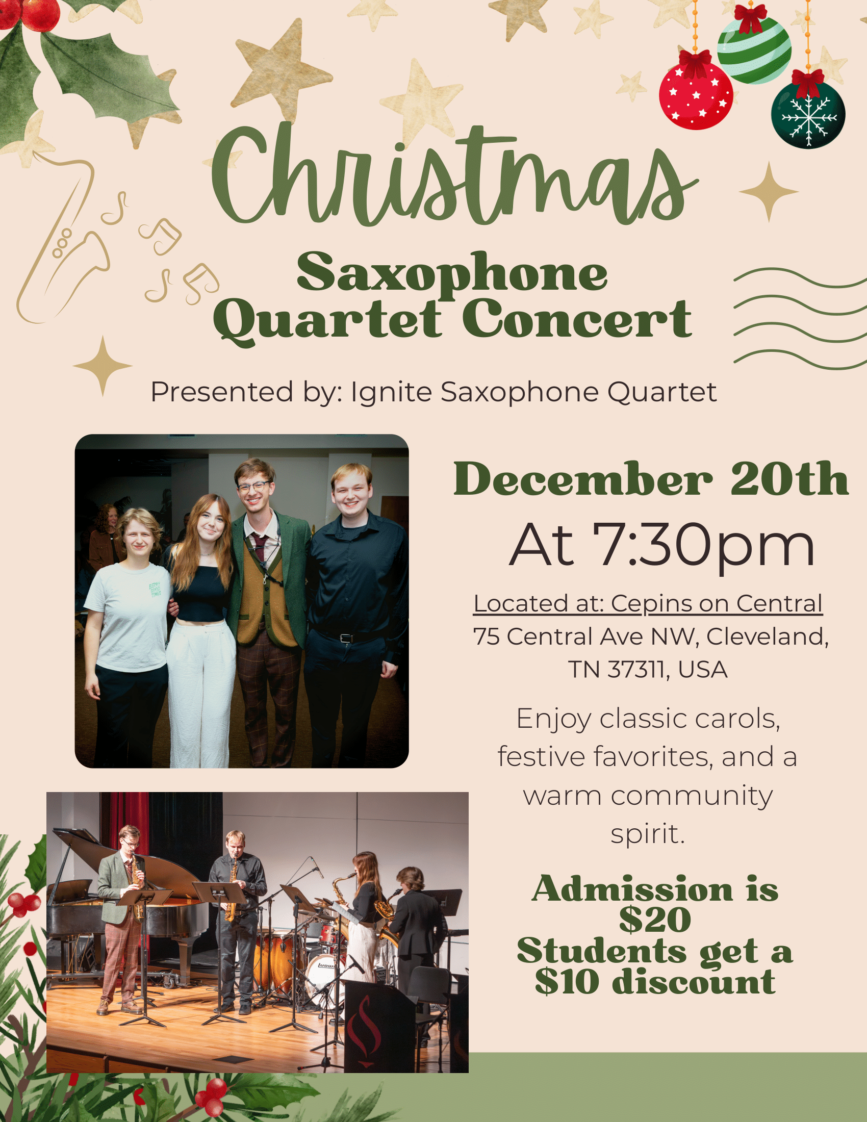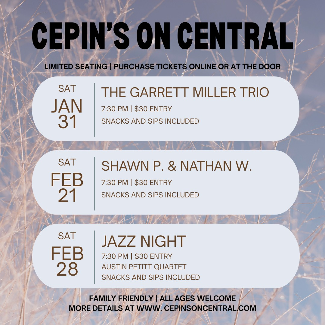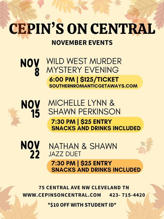 Cepin's on Central is an intimate music venue where we take time to put away our distractions and listen to good music. Currently the shows are Fridays and Saturdays 7pm. Genres range from jazz, folk, bluegrass, barbershop, classical and can be solo acts or a quartet. We are located in downtown Cleveland, TN at 75 Central Ave.